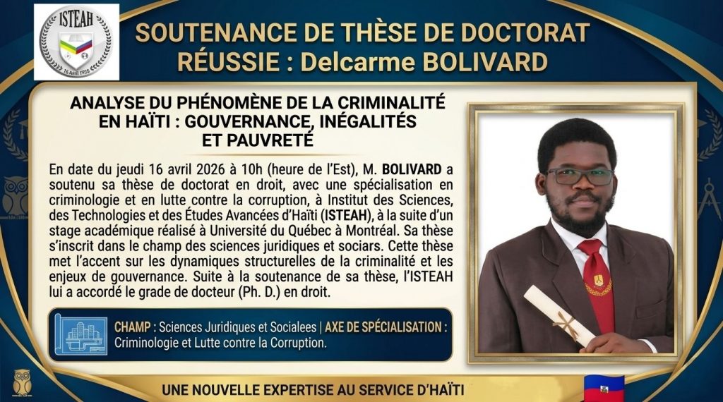 En date du jeudi 16 avril 2026 à 10h (heure de l’Est), Delcarme BOLIVARD a soutenu sa thèse de doctorat en droit, avec une spécialisation en criminologie et en lutte contre la corruption, à Institut des Sciences, des Technologies et des Études Avancées d’Haïti (ISTEAH), à la suite d’un stage académique réalisé à Université du Québec à Montréal. Sa thèse, intitulée : Analyse du phénomène de la criminalité en Haïti : gouvernance, inégalités et pauvreté, s’inscrit dans le champ des sciences juridiques et sociales. Cette thèse met l’accent sur les dynamiques structurelles de la criminalité et les enjeux de gouvernance. Suite à la soutenance de sa thèse, l’ISTEAH lui a accordé le grade de docteur (Ph. D.) en droit. Cette soutenance, tenue par vidéoconférence et suivie par un public académique et professionnel, a réuni un jury composé de M. Toussaint Pierre, Ph. D. (Président, Institut des Sciences, des Technologies et des Études Avancées d’Haïti), M. Bruce Broomhall, Ph. D. (Membre et Directeur de recherche, Université du Québec à Montréal), M. Mulry Mondélice, Ph. D. (Membre, Collège militaire royal de Saint-Jean et Institut des Sciences, des Technologies et des Études Avancées d’Haïti), M. François Roch, Ph. D. (Membre, Université du Québec à Montréal), M. Chantal Roromme, Ph. D. (Membre externe, Université de Moncton), ainsi que M. Jean Élifaite Gué, Ph. D. (Représentant de la Direction des affaires académiques, Institut des Sciences, des Technologies et des Études Avancées d’Haïti).