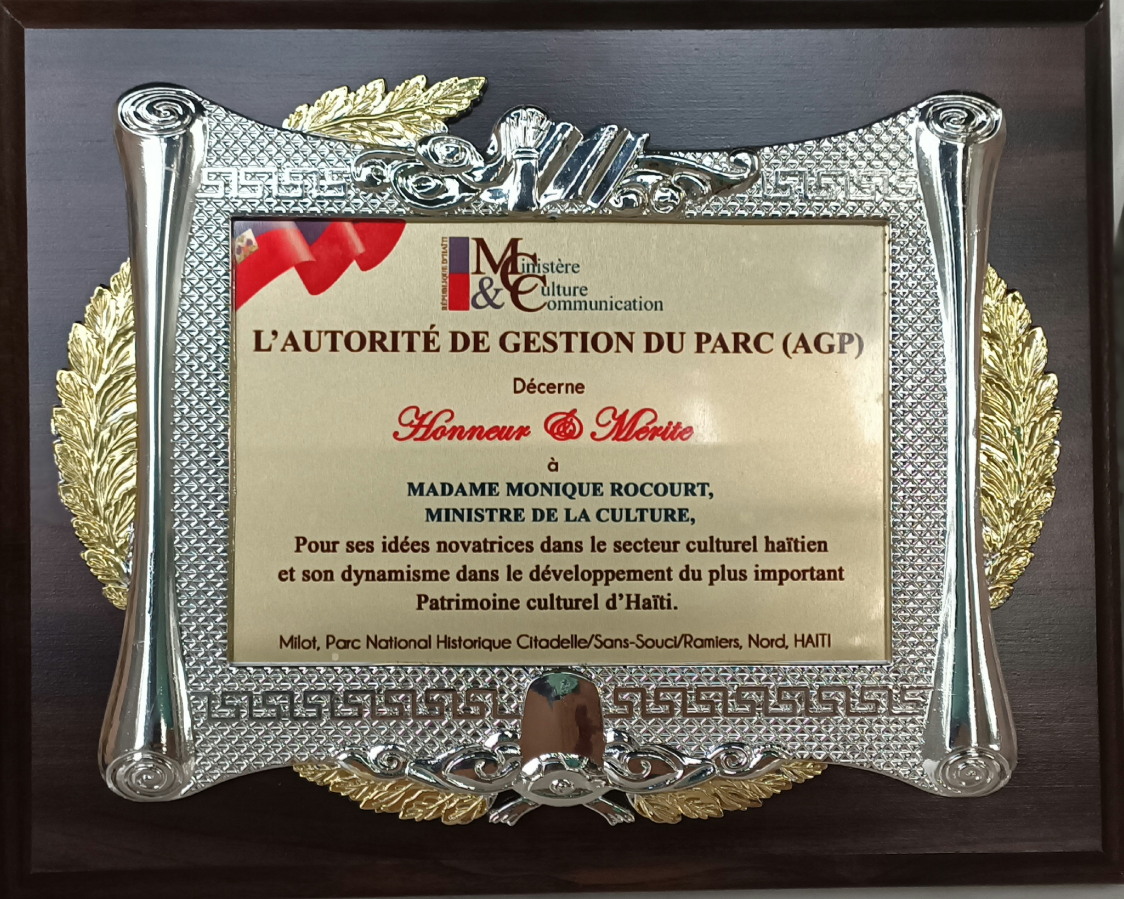 En ce qui concerne la culture et le patrimoine, Monique ROCOURT est l’une des personnalités qui a marqué son parcours professionnel. A cet effet, elle fut Directrice de l’Institut de Sauvegarde du Patrimoine National (ISPAN) et Ministre de la Culture. Ses fonctions dans l’administration publique ont beaucoup aidé dans le renforcement de la culture et dans la conservation des patrimoines culturels d’Haiti. Dans cette optique, l’Autorité de Gestion du Parc (AGP) qui gère le patrimoine culturel le plus important de l’Ile d’Haiti (Haiti et République Dominicaine), Parc National Historique Citadelle/Sans-Souci/Ramiers (PNH-CSSR), a rendu un hommage et décerné des distinctions à des personnalités contribuant au développement du Parc National Historique Citadelle/Sans-Souci/Ramiers, à des personnalités ayant contribué énormément à l’élaboration du Plan de Gestion du Parc National Historique Citadelle/Sans-Souci/Ramiers et à des parties prenantes du PNH-CSSR ayant été distinguées pour leur implication dans le Parc. Ainsi, ces mérites ne sauraient que le fruit d’un travail et d’une coordination symbiotique de différentes personnalités ayant contribué d’une façon ou d’une autre à un mieux etre au PNH-CSSR et à la création de l’AGP y compris à l’élaboration d’un ensemble de procédures, mécanismes et outils qui serviront bientot à une gestion optimale et de standard du Parc National Historique Citadelle/Sans-Souci/Ramiers. De ce fait, au terme de la fin du projet PAST en date du 29 juillet 2022, l’Autorité de Gestion du Parc (AGP) n’a pas laissé sauter cette occasion pour rendre un hommage mérité à Madame Monique ROCOURT et d’autres personnalités haitiennes et étrangères ayant contribué dans l’établissement d’une Autorité de gestion au PNH-CSSR, dans la protection et promotion du Parc National Historique et dans l’investissement dans l’une des communes du PNH-CSSR, c’est-à-dire, Milot, Dondon, Plaine du Nord et Grande Rivière du Nord. En ce sens, vu que le PNH-CSSR est reconnu tant en Haïti qu’à l’échelle mondiale pour sa forte valeur patrimoniale et paysagère au point que ICOMOS (2015) affirme que « les monuments du Parc National Historique d’Haïti sont les premiers à avoir été bâtis par des esclaves d’origine africaine ayant conquis leur liberté », considérant que la reconnaissance est la mémoire du cœur, les contributions de Monique ROCOURT, Ministre de la Culture de 2014 à 2015, au renforcement du Parc National Historique sont perçues comme un travail réalisé avec amour pour le patrimoine culturel haitien. Outre que Monique ROCOURT, quelles sont les vingt-neuf (29) autres personnalités haitiennes et étrangères contribuant au processus du développement du Parc National Historique Citadelle/Sans-Souci/Ramiers ayant reçu, cette année 2022, des distinctions ? Quelles sont les personnalités ayant contribué énormément à l’élaboration du Plan de Gestion du Parc National Historique Citadelle/Sans-Souci/Ramiers ? Pourquoi Monique ROCOURT est-elle honorée et quelle est sa contribution au PNH-CSSR ? Quelle sont les autres parties prenantes du PNH-CSSR ayant été distinguées pour leur implication dans le Parc ?